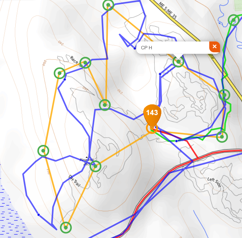 Instead we started coming back down the fire road but nabbed another stream/waterfall CP on the opposite west side this time. This one was further off but we attacked this from below using the stream making it easy to find but meaning we scrambled up 300 feet or so of slippery rock and in the process Bill took a spill. He was thankfully fine but broke his trekking poles, so that’s now 2 of us taking a spill this race and breaking gear… when we got this CP everyone sat/slouched for a rest. The course wasn’t crazy hard but it was pretty unrelenting. The crew was pretty sluggish and going through a lot of fluids again and now we’re all pretty beat up. I wanted to go bold and get at least 1 more CP; all options involving going totally off trail bushwhacking. We had 2 CPs in our vicinity, 1 was an out and back continuing up the stream but like 400 feet up the mountain. Chris/Bill unanimously said no to that one (I don’t blame them), but they agreed with me on a bearing/elevation shoot diagonal across the ridge about 250 feet up in elevation but no slippery rocks to a very likely non-existent trail (the RD’s didn’t even bold this one). So at best this trail last existed in 2016 when the map layer was made, so the plan was to hit the elevation of the CP and then contour at that elevation until we hit the flag… only we didn’t need to… cause we f’n nailed it, literally navigated right to the CP via the bearing/altimeter.