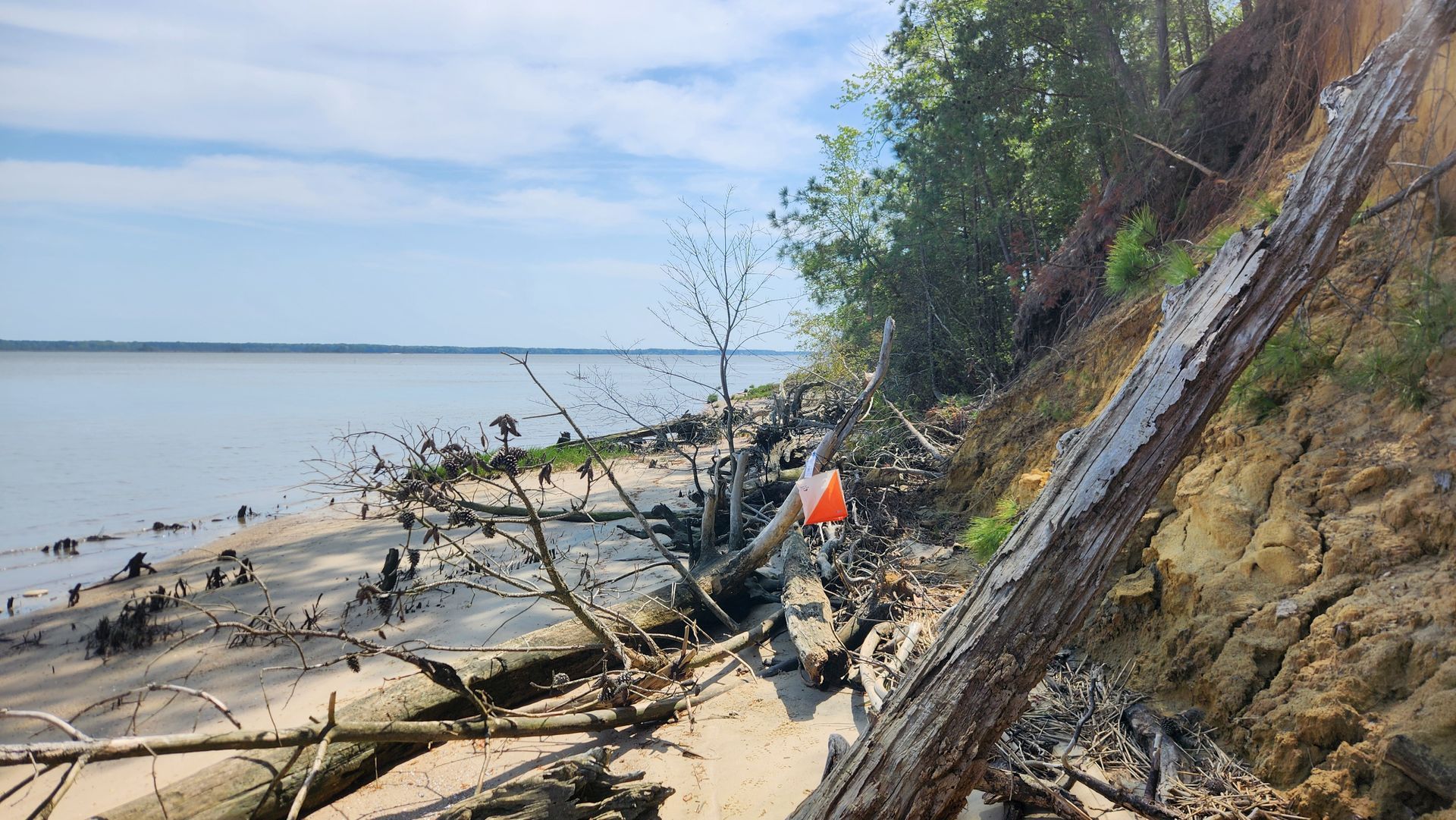After CP 6 (the massive hole) I decided to see if I could set CP 8 (a paddle CP) on foot. We scouted this one by boat but it was at the bottom of an eroded cliffside/beach on the river. If possible, then it would save me a lot of time by reducing needed paddling. I dropped the bike in the woods and initially kept finding the dangerous top of the eroded cliffside... after a few more attempts I was able to bushwhack my way down some nasty vegetation via a reentrant to the beach, scrambled my way over driftwood and downfall to the spot, success! That meant 1-2 less miles of paddling needed to set the course.