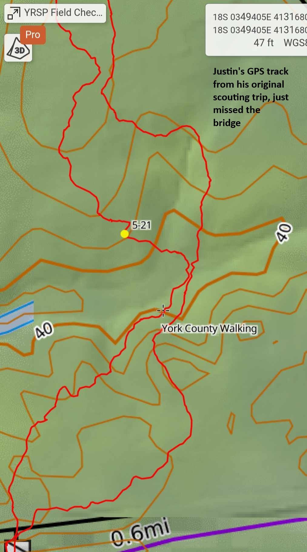 Most interestingly CP 21 is set in a section of park property we were told used to have a MTB trail system until Hurricane Isabelle knocked so many trees down that the park just abandoned it. Justin scouted this area for me and found an old abandoned trail arrow sign that we turned into the checkpoint, but interestingly as I walked out there to set the point I managed to not only find the old trail itself… but found multiple perfectly in-working-order bridges to cross the stream in the area. I really hope they bring back that trail system some day because it's a beautiful section of secluded woods, perfect for some mountain biking.