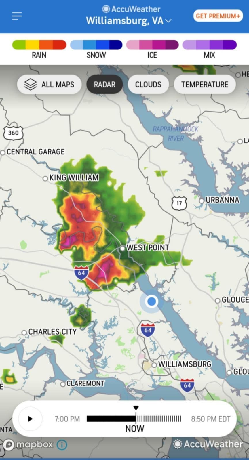 Knowing this was a possibility we covered pre-race that we would be doing a “stop and hold” in any TAs if we detected lightning and that any racers should shelter in place with whatever was nearest by. We looked at the weather apps 2 more times in 5 minutes and it was clear what was about to happen so while I was talking on the phone to a person down at Waller-Mill at 7:07pm (verified time by looking back at text group) I asked Janine to text the race group that we were on official stop-and-hold at any TAs, lighting was detected just 3 miles away at this point and the sky was turning dark. Maybe 1 minute later the skies opened up and it POURED.