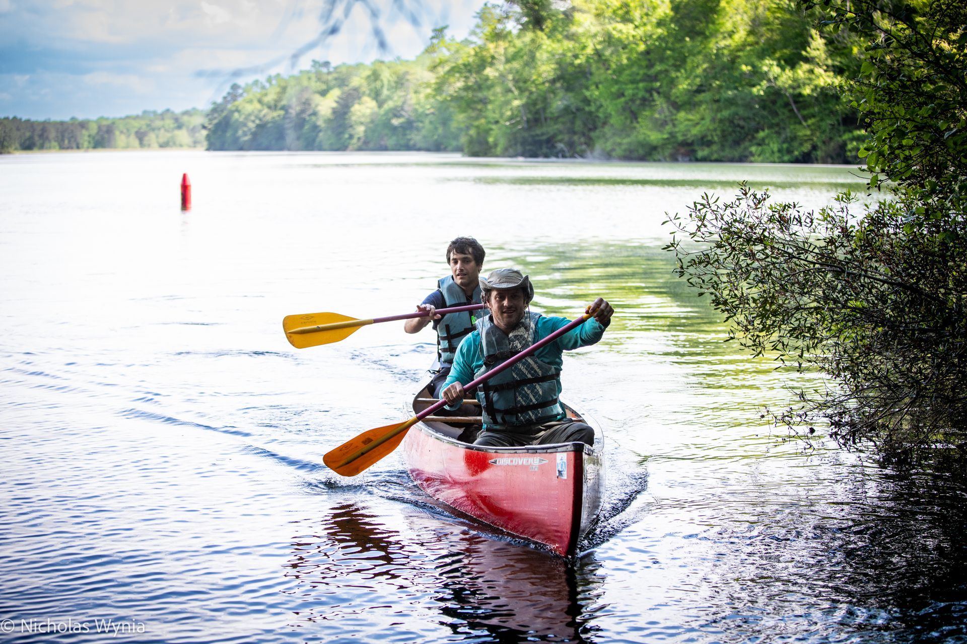 While all the kayaks and canoes are on the fire road behind a 2nd gate, the lifejackets and paddles are more out in the open in front of the gate. We assumed because the road to the launch gets locked at night it’d all be fine… and to this day I still think it would have. So I go back and forth with "old timer" a bit, but I don’t want to argue with him, as he is genuinely calling me out of concern. He tells me he locks the road gate at 8pm so I should go move the stuff before then. I tell him I’ll head out there and move the gear… so at 6:45 our food arrives, I eat super fast and jump in the truck to drive 20 minutes back out to Croaker Landing by myself arriving around 7:25ish and I scramble to move 180 paddles and PFDs about 200 meters behind the gate and slightly off to the side in the woods. I finish at literally 7:58pm and I’m worried old-timer is gonna lock the gate with me inside, hah. I leave just as the last 2 cars are leaving the fishing pier so definitely no one in the area overnight and the ranger is arriving to lock the gate just as I drive out… now we’re done for the night…