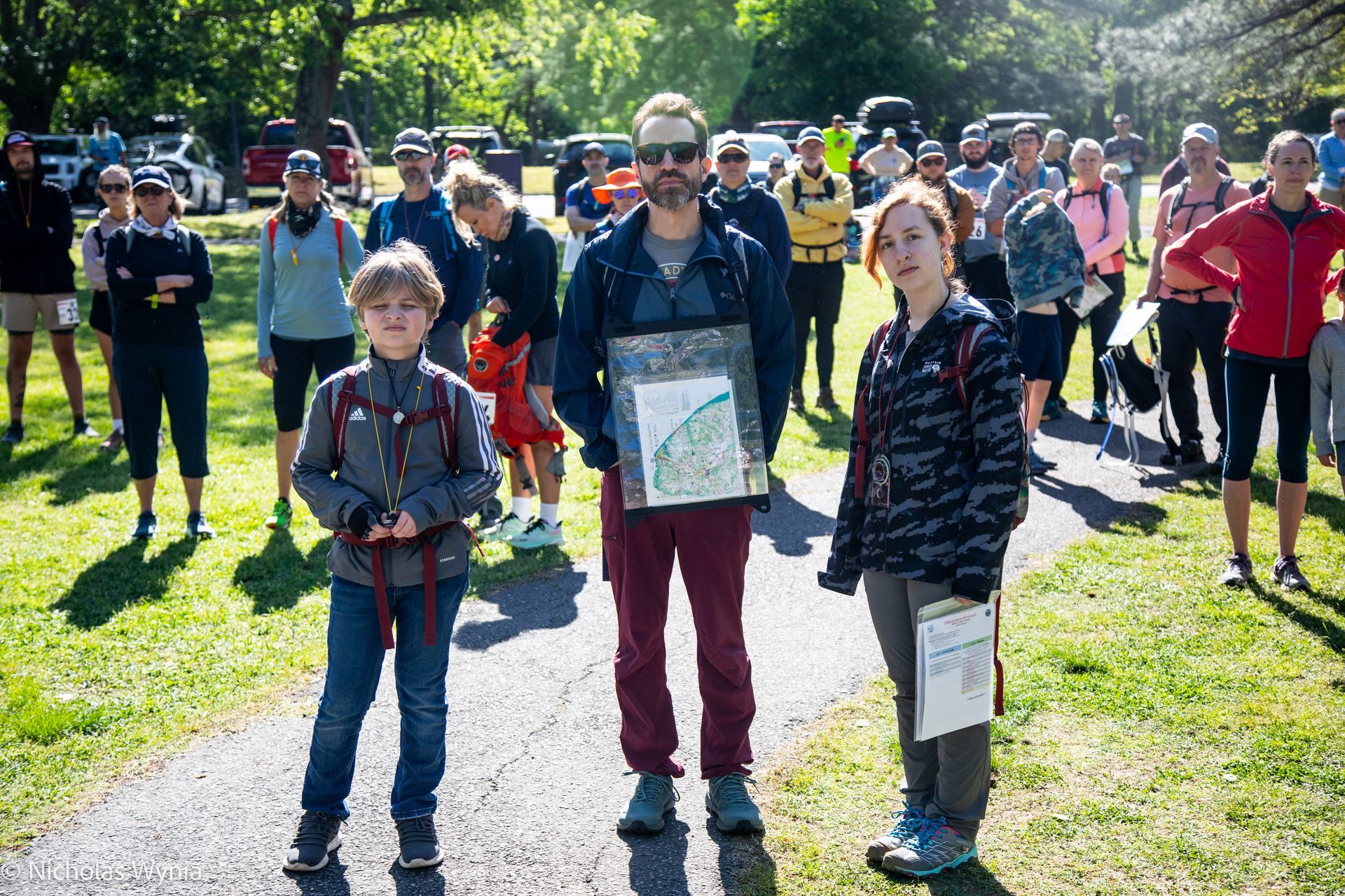 9:30 race briefing time and all going great, I warn family teams about T2 (CP 43 from the 15-hour) with the heavy mountain laurel / vegetation, and then I decide to make a special call out to name the 20 racers who are racing again today after having just done the 15-hour race yesterday… and they all look like zombies too, hah. Some of them had family members planning to be competitive today too, hopefully their bodies could keep up with that.