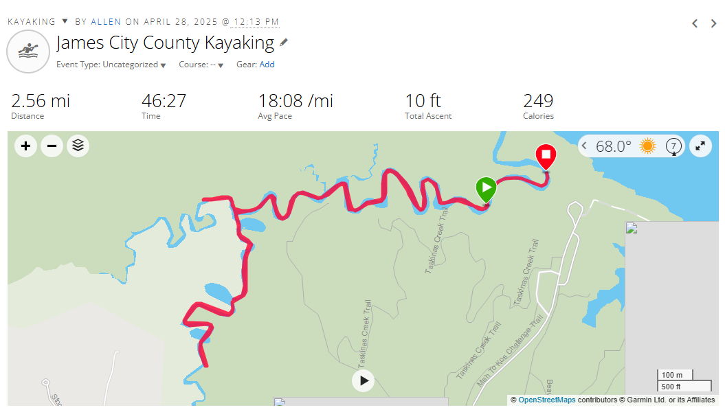 I quickly message the group and within a minute Dawn and Justin produce pictures of those tags, they have them, so only 2 CPs left to go get in Williamsburg. So I load up a kayak on the roof of the Subaru and make the drive 2.5 hours back down to Williamsburg. Its a pleasant and quiet drive and gives me a lot of time to think. When I arrive its almost surreal as the park is totally empty except for a few park rangers. I quietly take the kayak down to the boat launch, hit the water at 12:13pm, no podcast or music this time, I just want the peace and quiet to relax and get to the final 2 checkpoints. Both are no problem as I’m doing this at peak high tide, then paddle back and I’m done in 56 minutes. I load the kayak back on the car, and then I go over to the Taskinas Creek overlook to just rest and reflect for a minute, what an amazing week/weekend.